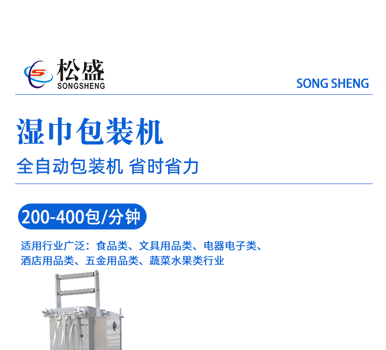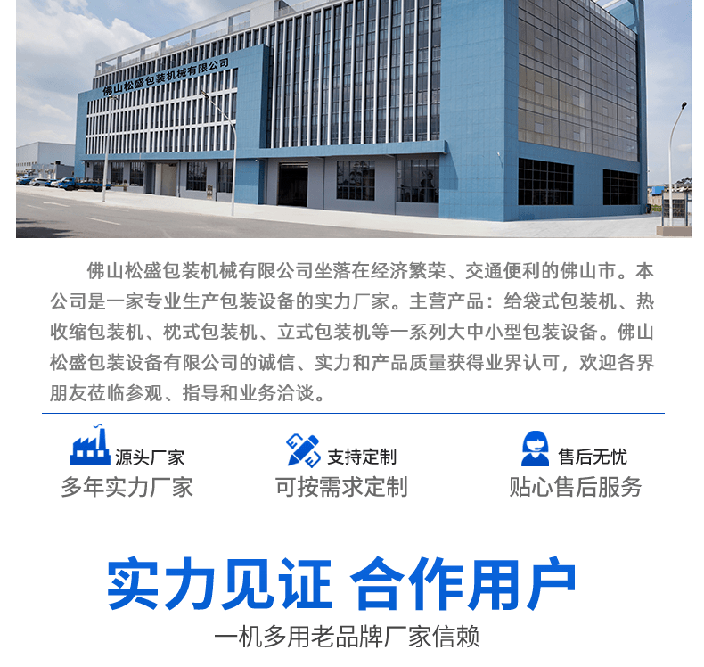 佛山市松盛包裝機械有限公司專業(yè)生產(chǎn)給袋式包裝機,枕式熱收縮膜包裝機,粉劑包裝機,顆粒包裝機,醬料液體包裝機,高速濕紙巾包裝機,全自動計量稱重填充包裝,廣泛應用于食品包裝、日化包裝、醫(yī)藥包裝、工藝品包裝機、五金包裝、玩具包裝、農(nóng)業(yè)化工等塊狀、條狀、顆粒、液體、粉末產(chǎn)品的全自動包裝機械;集研發(fā)、設計、生產(chǎn)、銷售為一體的包裝機械自動化設備廠家。